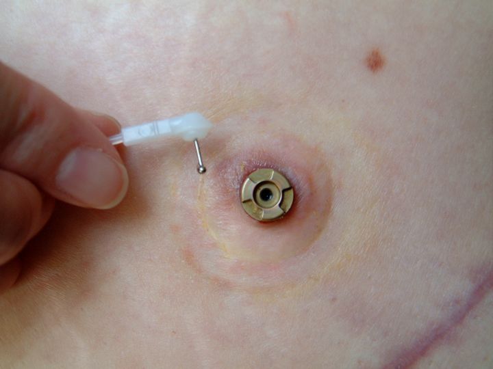 The only visible part is a metal bit like the tip of a tube, about half a centimetre high and half a centimetre wide, that pokes through the skin. This is fixed in place with a plastic wheel-like thing, about 2cm diameter, which I have to wear for the first 3 months. There is also a plastic cannula of about 10cm underneath the skin that reaches into my peritoneal cavity. I have to go back to Bournemouth to have the inner catheter changed every 3 months. This will be done within a few minutes by the surgeon, in the day theatre, without any need for anaesthetic.